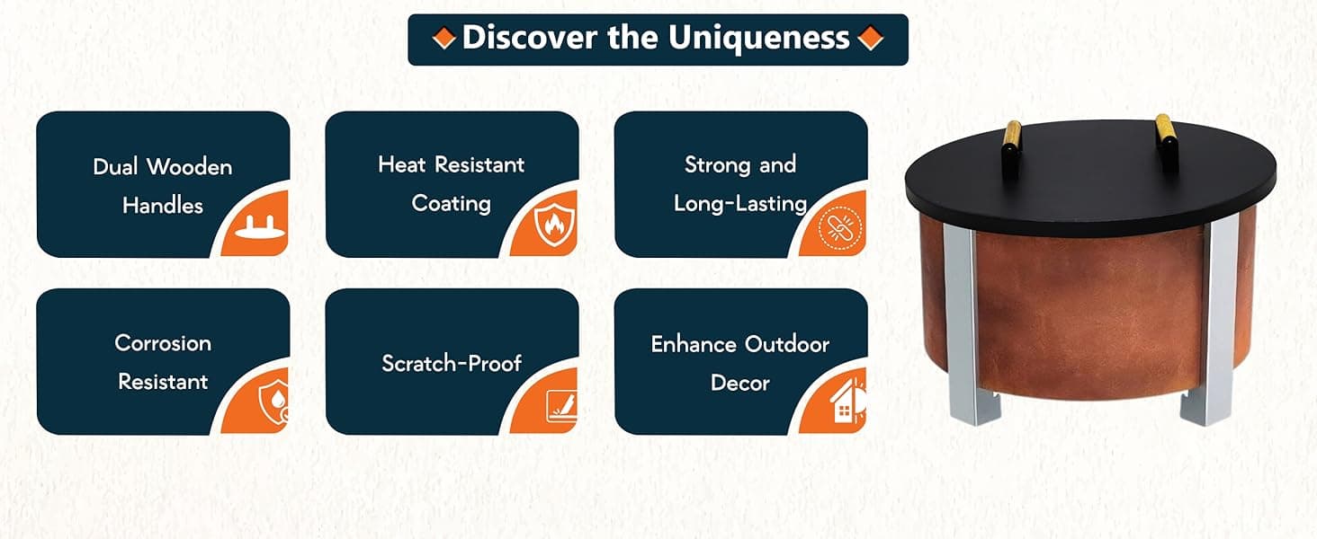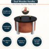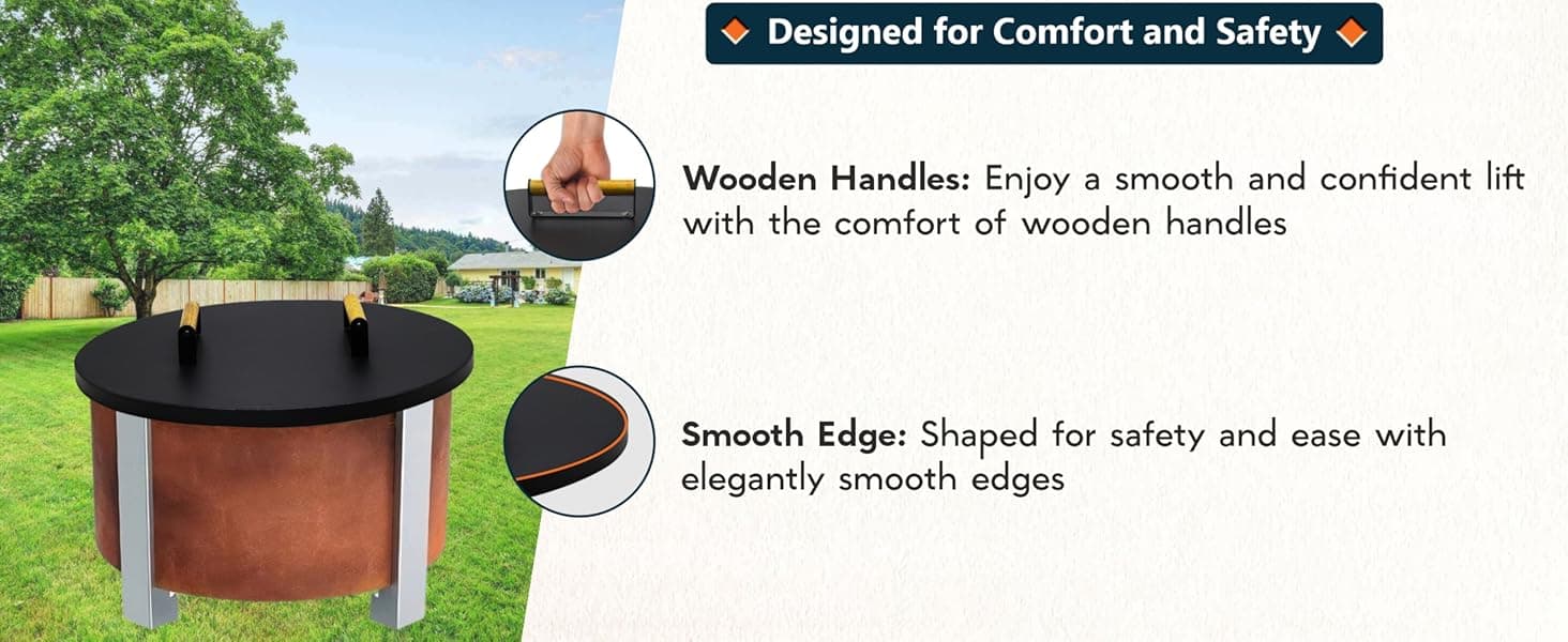 - Ergonomic Handles: Our 22.5″ table top fire pit lid features a wooden handle that remains cool to the touch, allowing for easy handling and manipulation of the lid, even when the fire pit is in use.