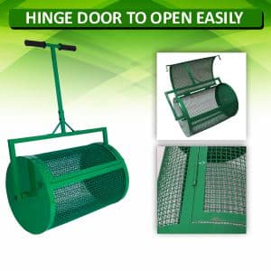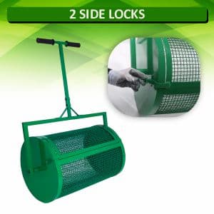 All-iron construction and powder-coated finish make this peat moss spreader sturdy, rust-proof, and long-lasting. Besides, two locking clasps are firmly built to make sure it stays closed during rolling.