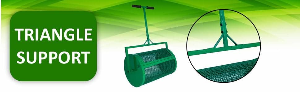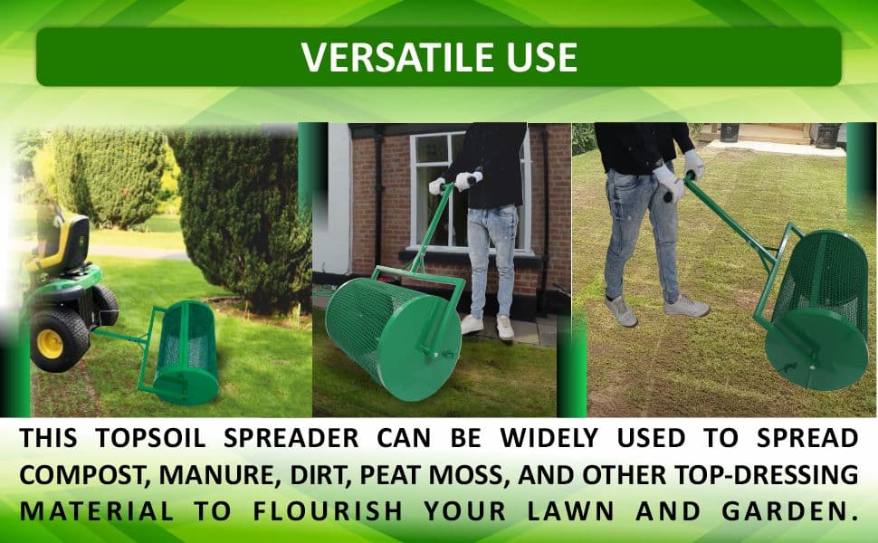MULTIFUNCTIONAL: Our soil spreader is very handy in use. Just install the handle, add compost, dirt, peat moss, etc. Lock the latches, and roll it on your lawn. The topsoil spreader runs smoothly on different terrains, like slopes and uneven surfaces, with ease. So eventually, you will expect a healthier and lush lawn and garden.