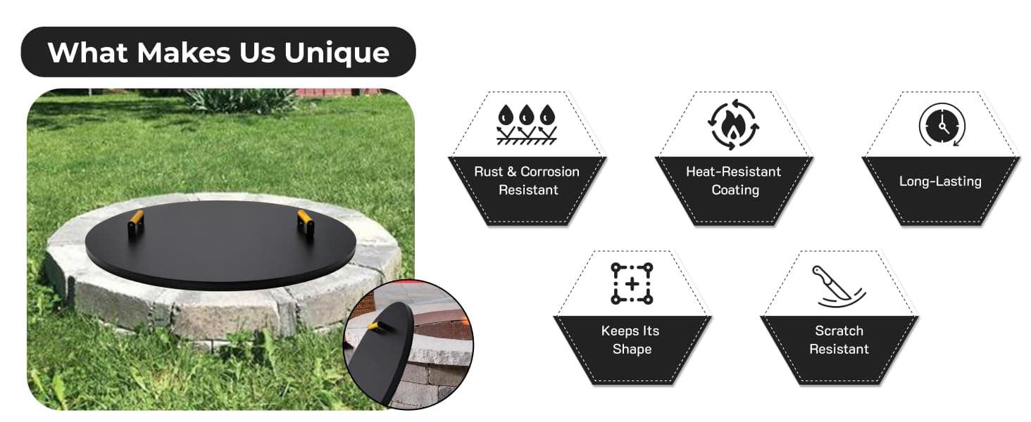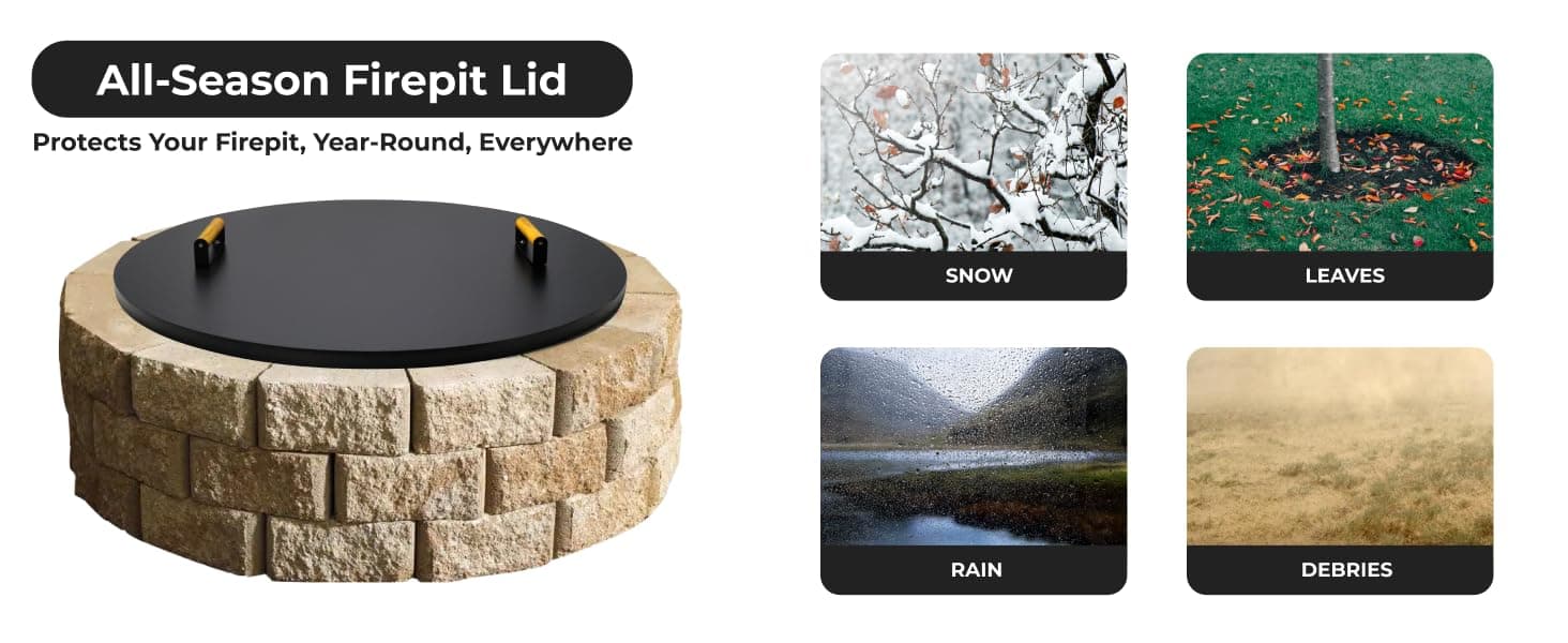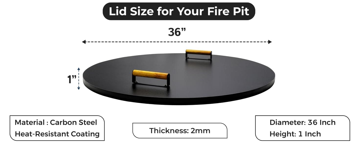 - Resilient Weather-Resistant Coating: Built to endure harsh outdoor conditions, this fire pit lid is coated with a heat-resistant, rust-resistant finish that provides lasting protection while preserving its sleek appearance through every season.
