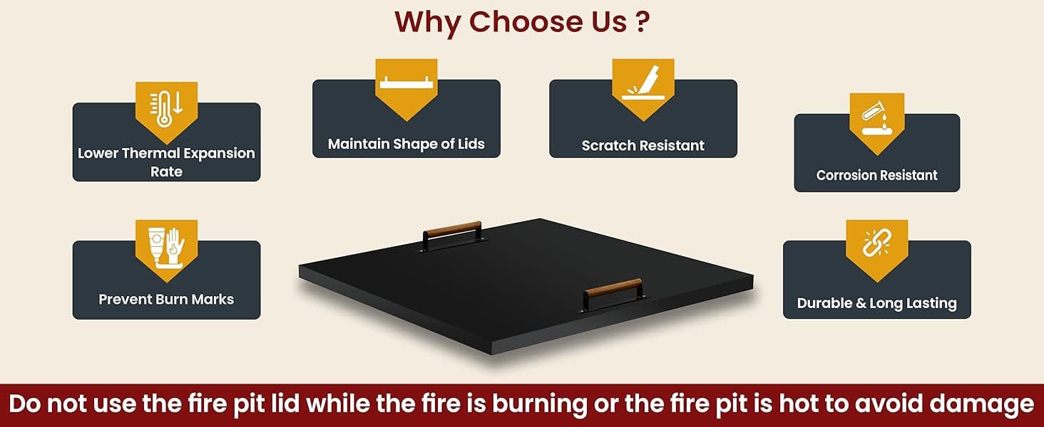 - High-Quality Material : Our fire pit snuffer lid steel pan cover square is built with high-quality steel material of 1.5mm thickness. This outdoor fire pit lid square measures 38” diameter in size.
