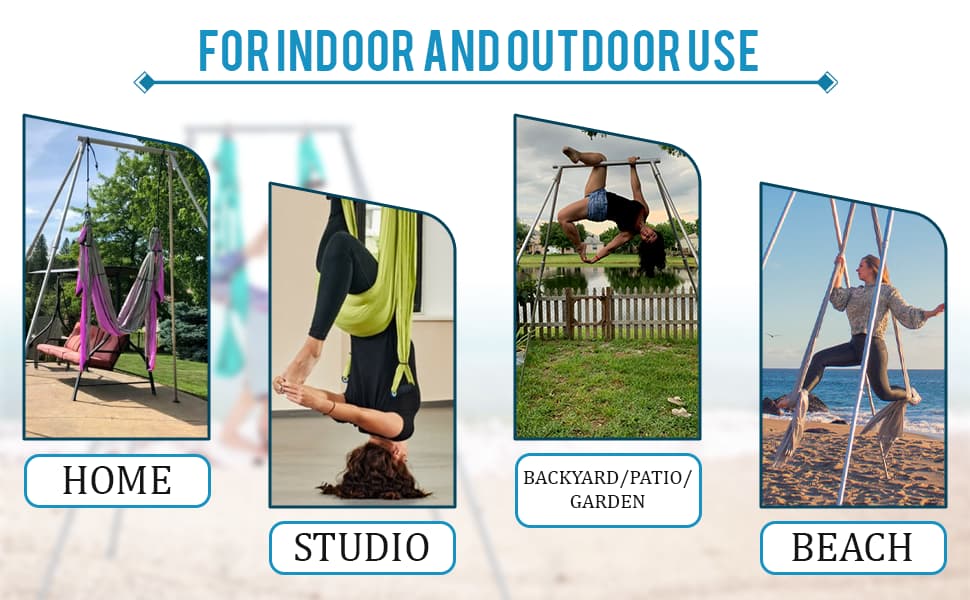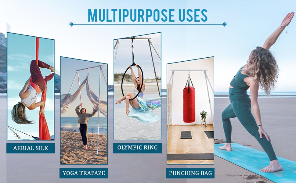 Versatile Application: This stand is perfect for a variety of activities, including aerial yoga, swings, hammocks, silk, Lyra, and even as a pull-up bar. It’s ideal for practicing different yoga poses and stretching routines, and can be used in various locations such as your home, park, backyard, or studio.
