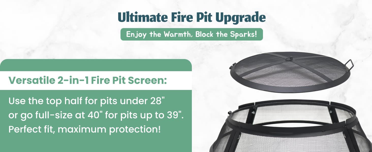 - Versatile 2-in-1 Fire Screen :Designed with 2 distinct sizes to fit your fire pit ring . Use the top half alone for a fire pit with an inside dia less than 29.3″, or use the fully assembled 40 inch fire pit screen for fire pits with a dia less than 39″ .