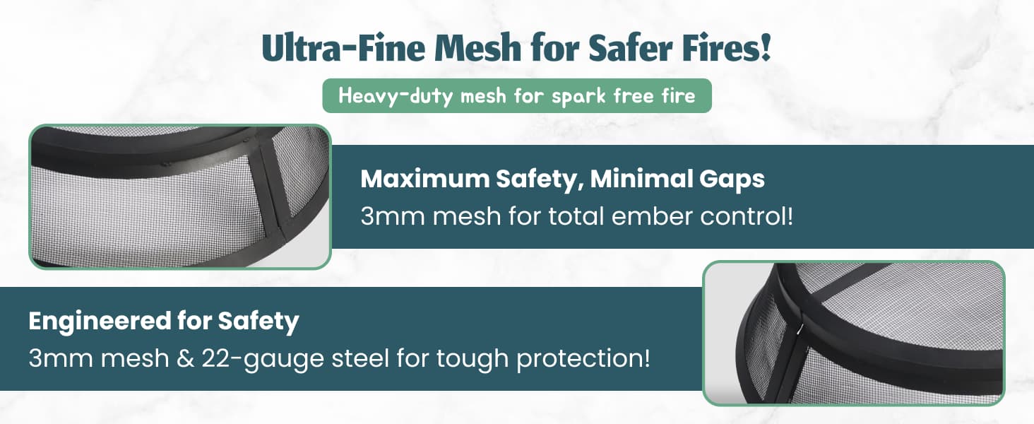 - Engineered for Strength: fire pit screen round is made of (2mm) thick carbon steel & 3x3mm square mesh top, this fire pit spark screen offers durability and longevity. Perfect for outdoor fire pit owners .