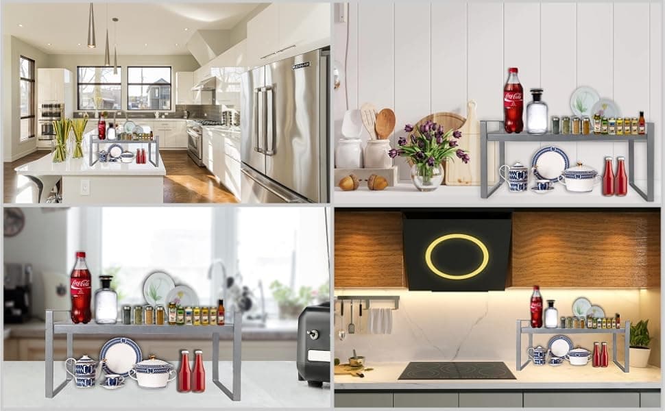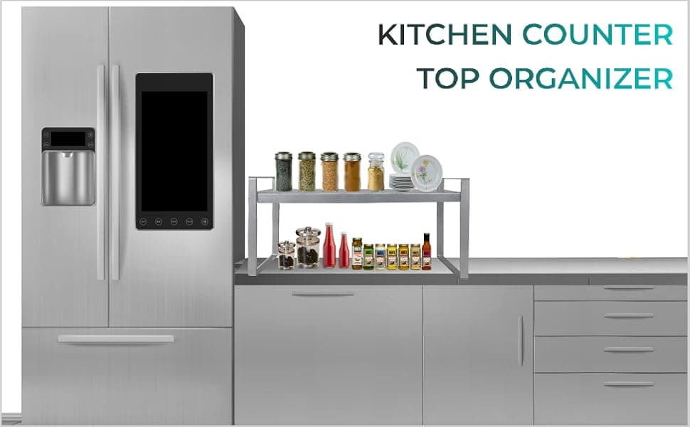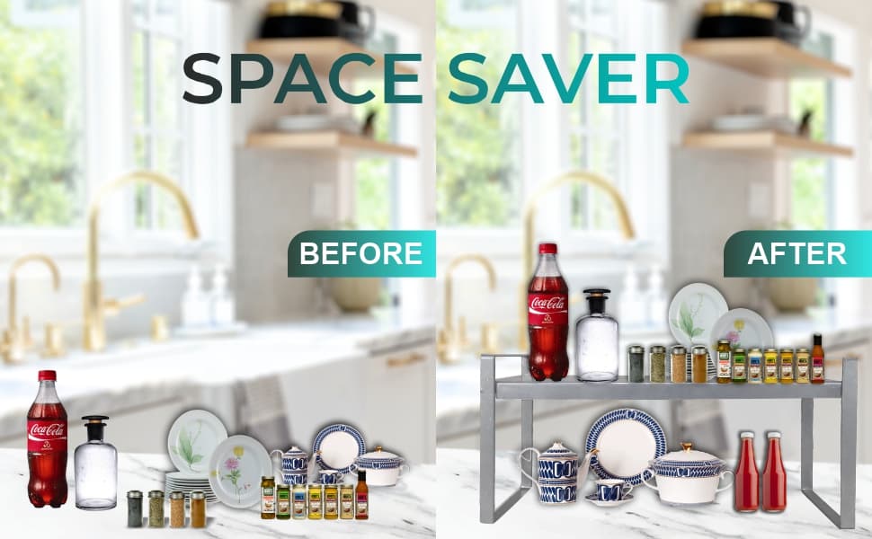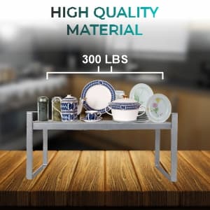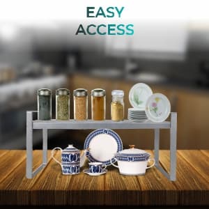- Multipurpose Utility- This organizer shelf can be useful for your kitchen countertop, cabinet, pantry, cupboard, bathroom, windowsill, under the sink, garage, office, and more places. It is a great organizer to store plates, bowls, pans, spices, canned foods, condiments, jars, tableware, kitchenware, cosmetic items, shower gel, towels, toiletries, books, files, magazines, and other such things.