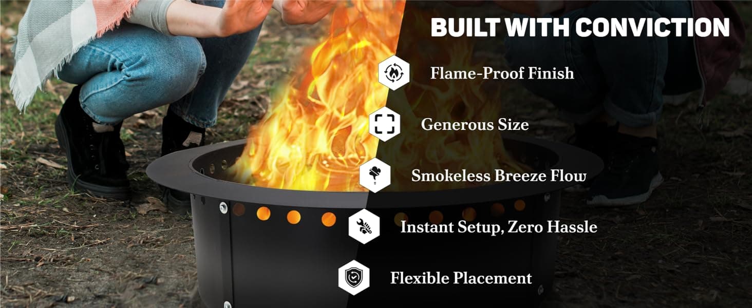 • Generous Size with Smokeless Features: With a spacious 36” diameter, this fire pit ring provides ample room for cozy bonfires and features advanced airflow technology to reduce smoke, perfect for enjoying outdoor evenings with family and friends.