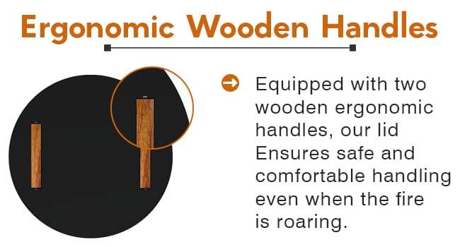 - Dual Ergonomic Wooden Handles: Designed with two ergonomic wooden handles, this firepit lid offers safe, comfortable handling and easy transportation.