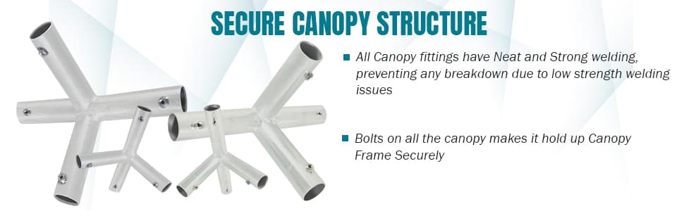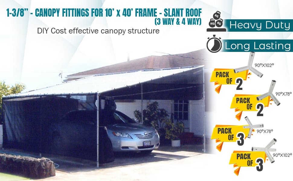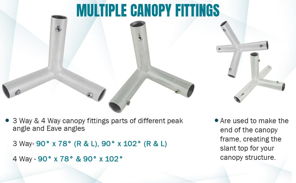 Purpose: Canopy 3 Way and 4 Way Pipe Fitting Couplers can be used to build slant top canopy structures like temporary Tent, Carport, Garden Shade, Greenhouse, Boat Shade, Batting Cage, Party and Wedding Tents.