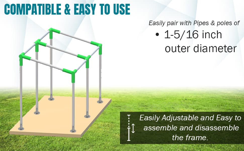 Size: Internal diameter of leg is 1-3/8 inch, which fit with 1-5/16 inch outer diameter of pipes & poles.